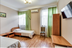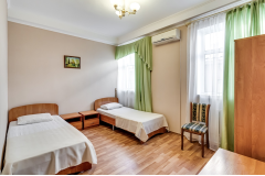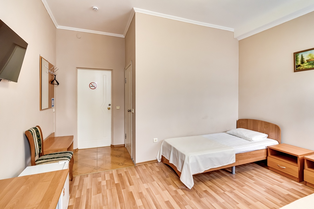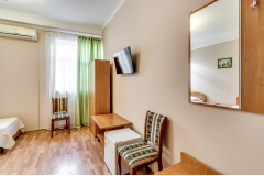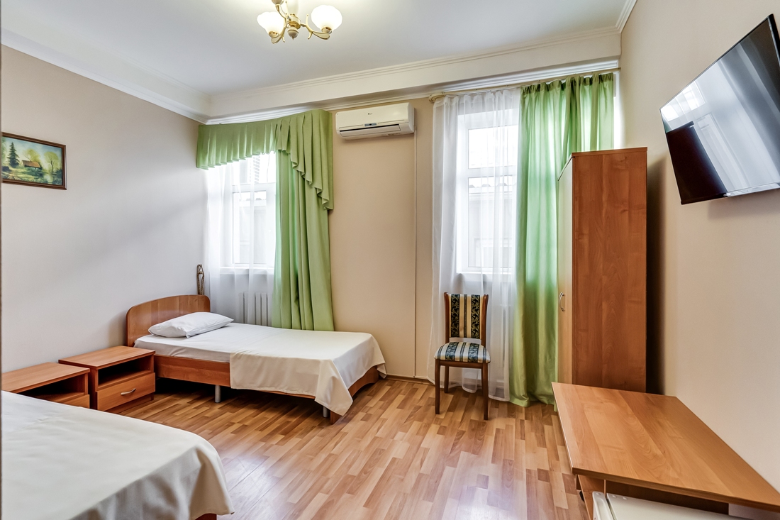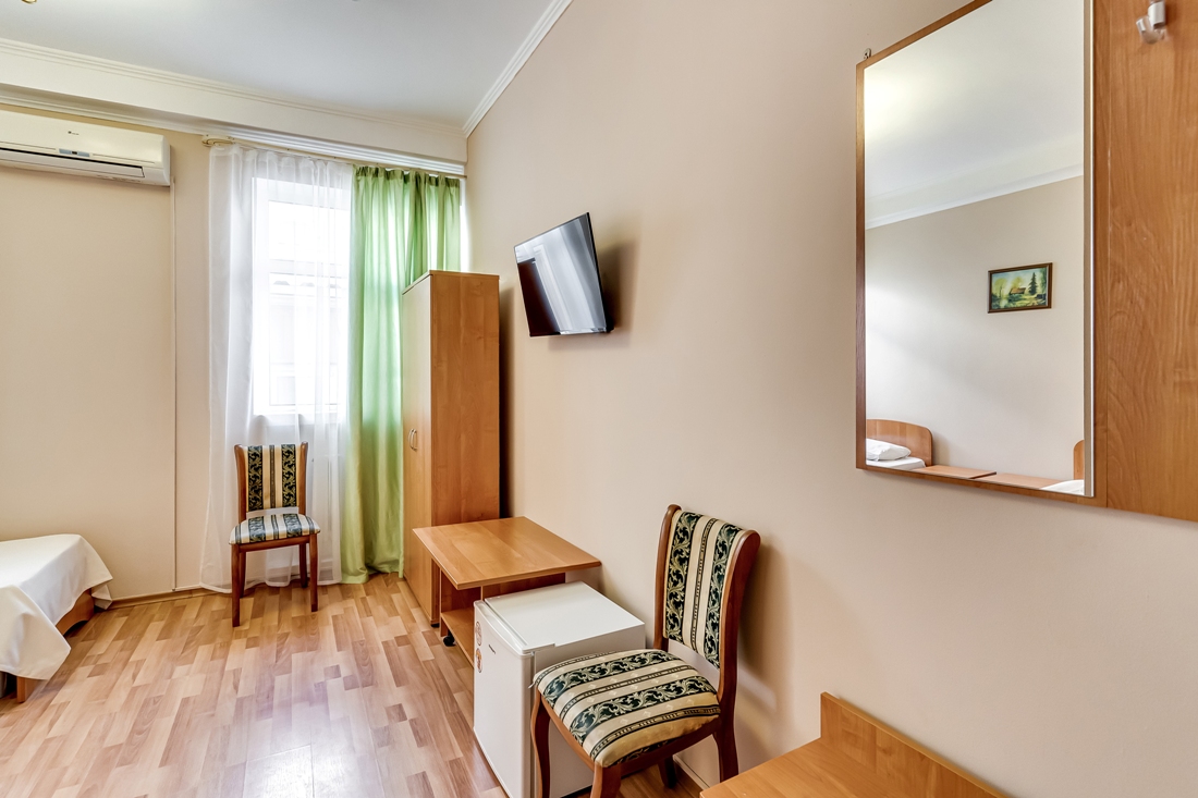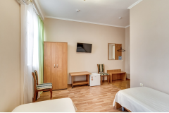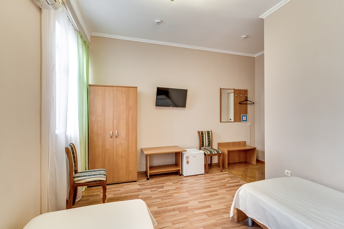 Он меблирован двумя односпальными кроватями, столом со стульями, платяным шкафом и большим зеркалом, перед которым можно переодеваться. Так же здесь есть телевизор с множеством каналов, а комфортную температуру в помещении можно поддерживать благодаря сплит-системе. Санузел находится прямо в номере и оснащён душевой кабиной.