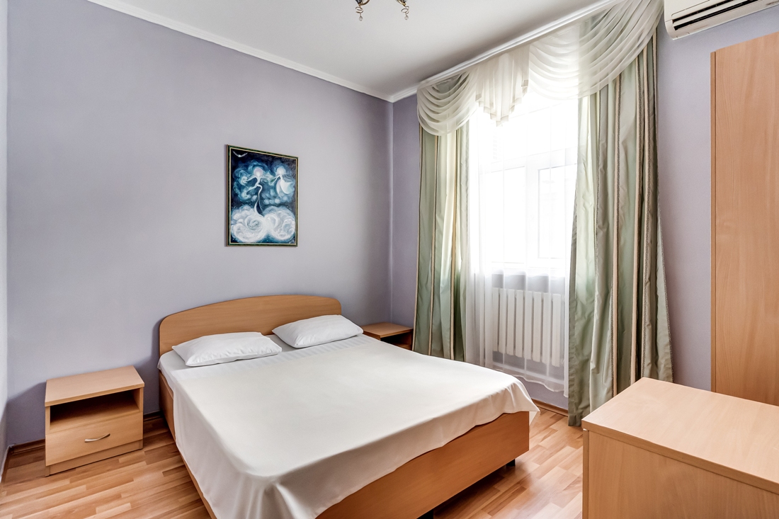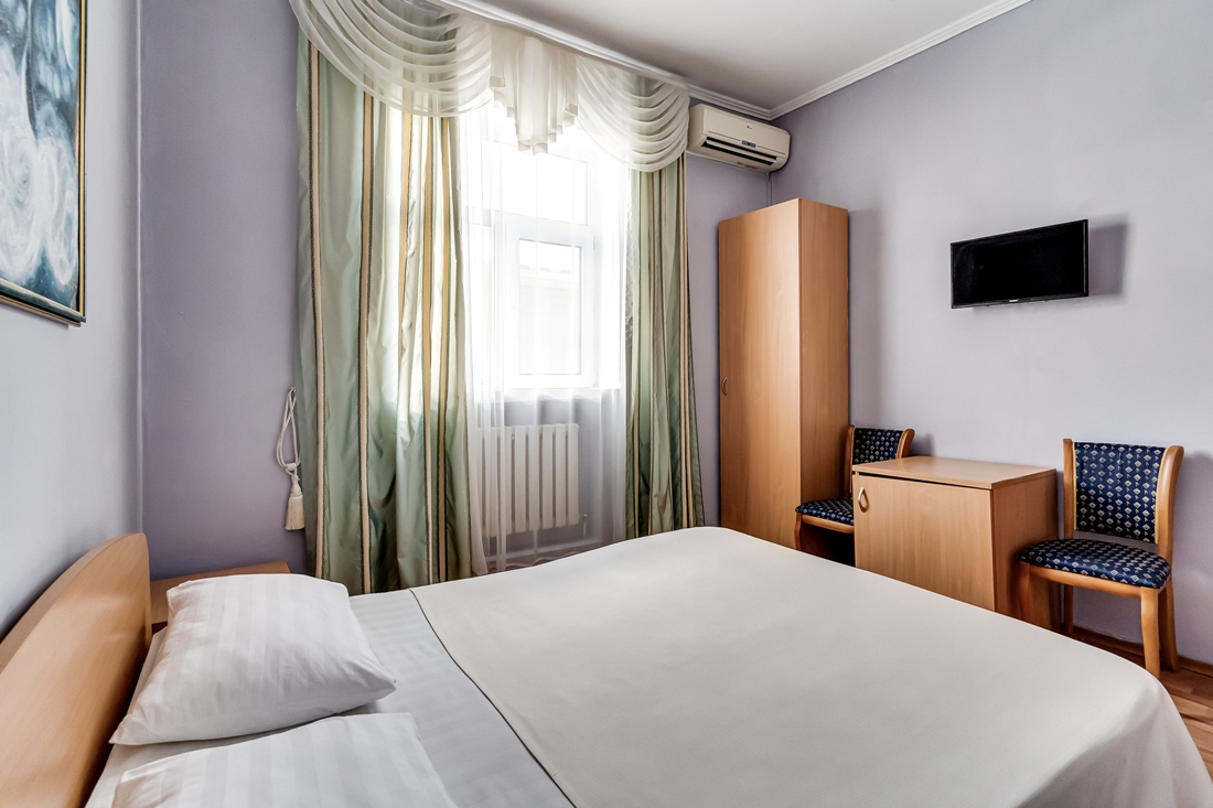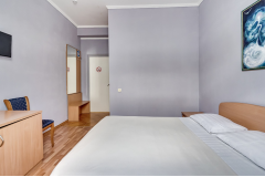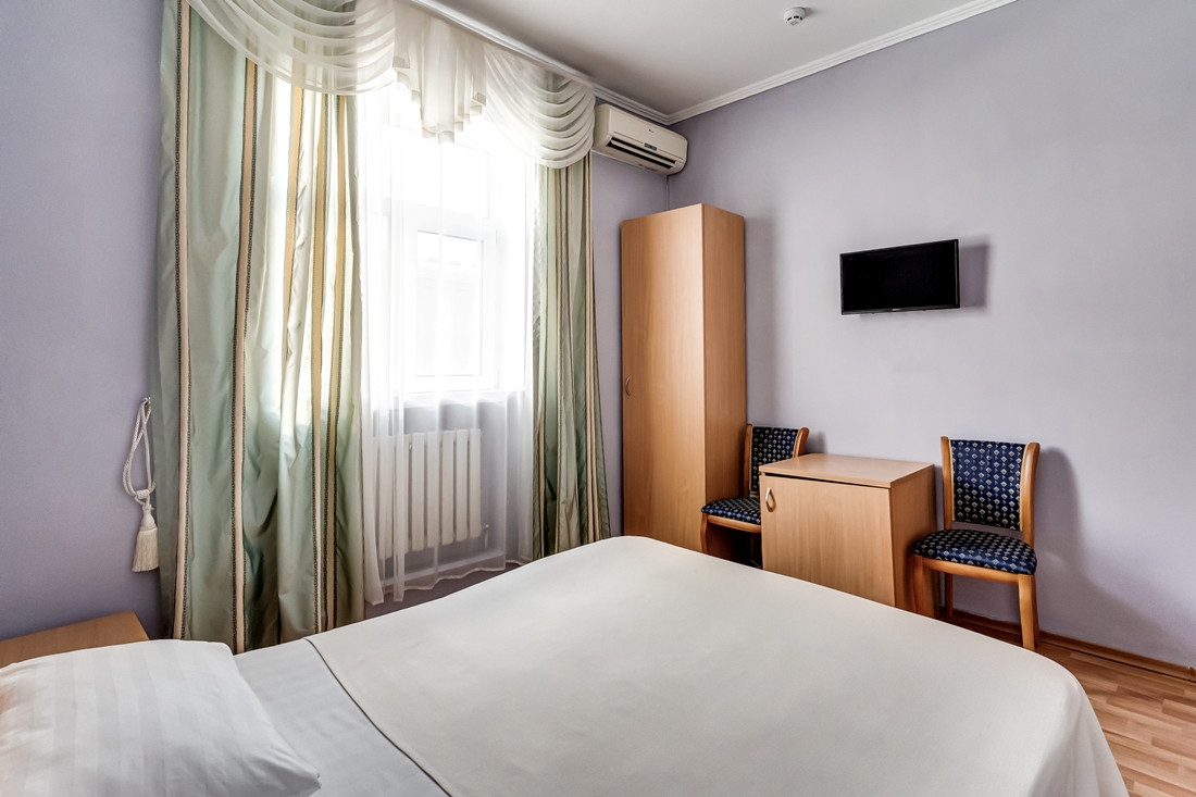 Он рассчитан на размещение двух взрослых гостей, либо семейную пару с ребёнком. Номер оформлен в современном стиле и обставлен всем необходимым: двуспальной кроватью, столом со стульями, платяным шкафом с вешалками. Привести себя в порядок после дороги можно перед большим зеркалом. А если захочется развлечься просмотром передач - к вашим услугам современный телевизор.