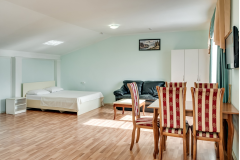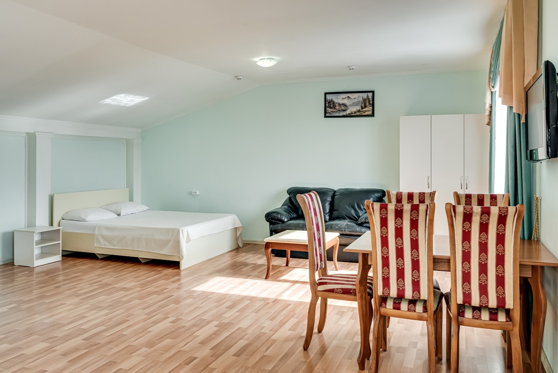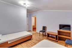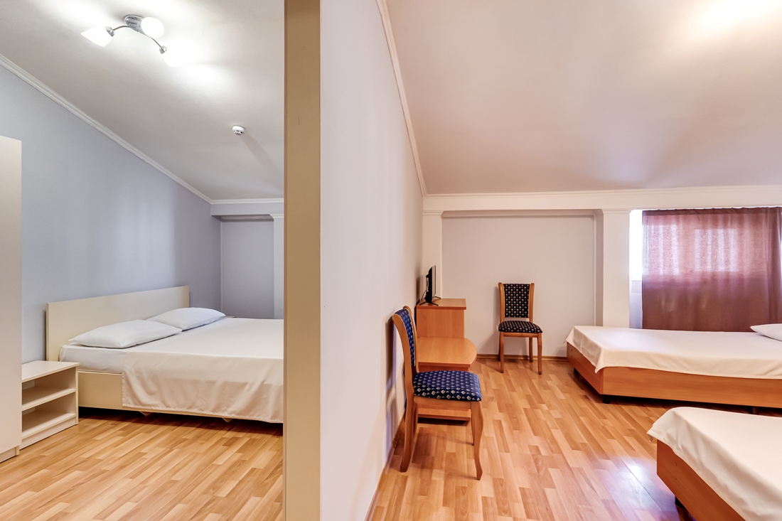 Номер меблирован двумя двуспальными кроватями, столом со стульями, журнальным столиком, удобным кожаным диваном, шкафом для одежды, тумбочками – словом всем необходимым для комфортного размещения. Так же установлен сплит, который позволит отрегулировать температуру по своему вкусу, есть телевизор с множеством каналов и холодильник.