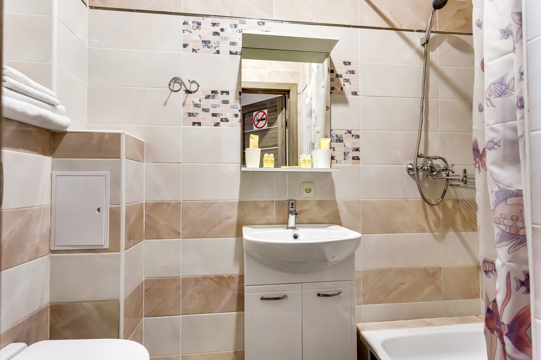 Санузел с душевой кабиной находится в номере, предусмотрены косметические средства для гигиены, домашние тапочки и полотенца. Дополнительно при необходимости предоставляется фен.