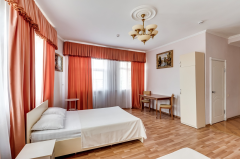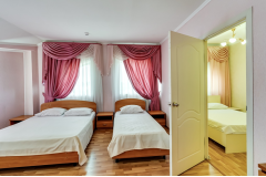 Он состоит из двух комнат и рассчитан на тех, кто путешествует большой компанией или семьёй. Номер оформлен в современном стиле и обставлен всем необходимым. Меблировка включает две двуспальные кровати king size и одну односпальную, стол со стульями, шкаф для одежды, тумбу и кресло.