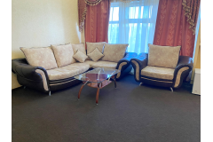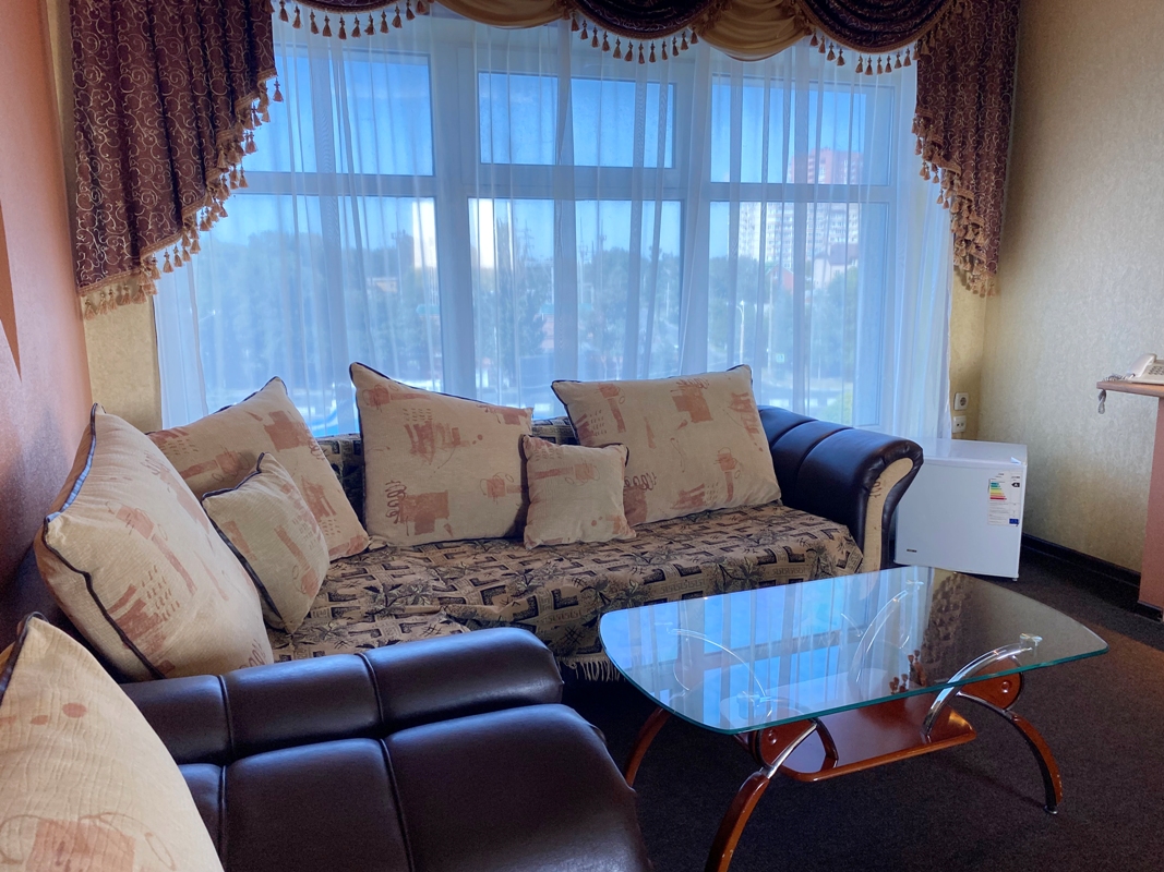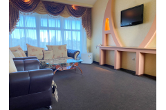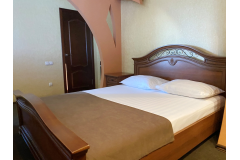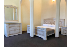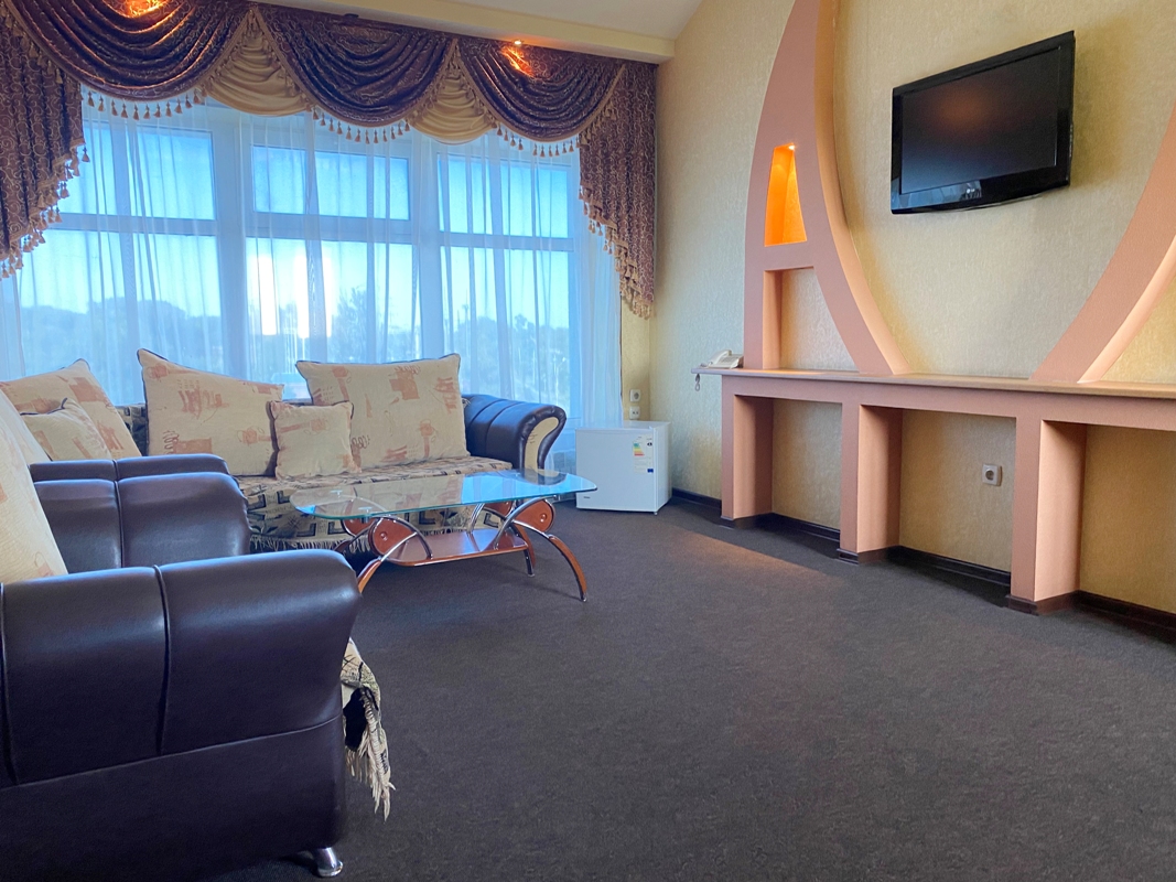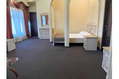Просторный номер с ванной комнатой. Оборудован: кровать, большой раскладной диван, сплит, ЖК-телевизор, холодильник, стол, стулья, тумбочки. Есть одноразовые душевые принадлежности и тапочки.