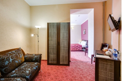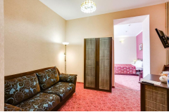 Семейный двухкомнатный номер площадью 32 кв.м с балконом, в котором комфортно может разместится 4-е человека. В номерах данной категории одна двуспальная кровать. Каждому гостю предоставляется комплект из 2-х полотенец. В номере телевизор. На всей территории отеля бесплатный WI-FI. Кофе, чай, сахар - комплимент отеля.